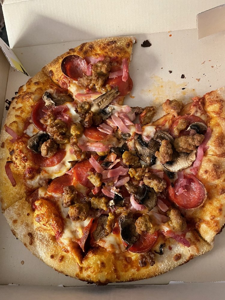Pepperoni, ham, mushroom, green pepper, onion, italian sausage, beef, black olive, & extra mozzarella